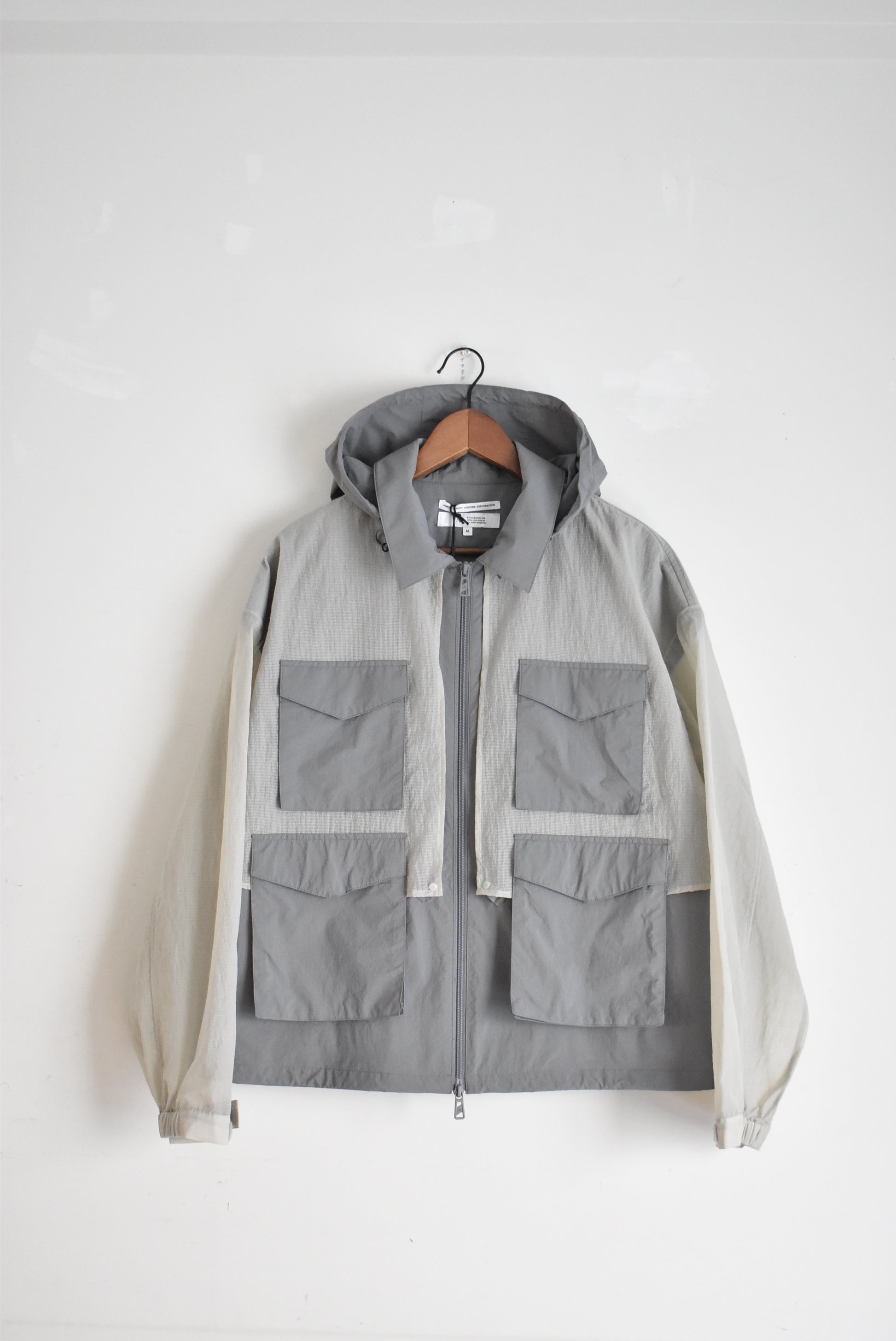 シワ加工を施したナイロン生地とリップストップ構造のメッシュ素材を組み合わせた、軽量かつ通気性に優れたジャケット